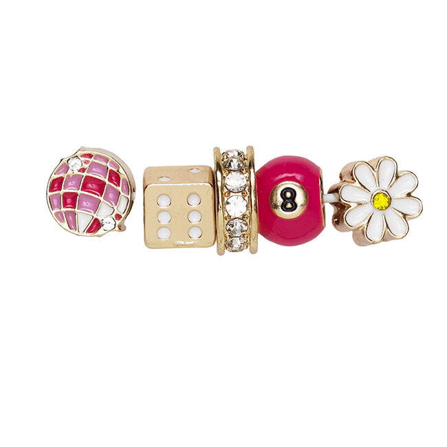 Pakkaus sisältää seuraavat riipukset: diskopallo strasseilla, noppa, biljardipallo, kukka ja strassirenkaan! Renkaan halkaisija on 12 mm ja paksuus 4 mm - muut riipukset ovat halkaisijaltaan 10-12 mm ja paksuus 7 mm. Reiän reilu halkaisija, 4 mm, tarkoittaa, että helmet sopivat hyvin paksuihin nauhoihin, ketjuihin ja kengännauhoihin. Aivan oikein - kenkien koristelu näillä hienoilla yksityiskohdilla saa ihmiset varmasti katsomaan kahdesti!