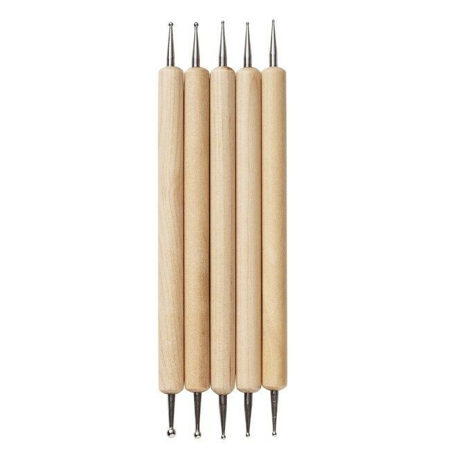 5-pakkaus kohokuviointityökaluja paperitöihin / kohokuviointiin - mutta myös erinomaisia savityökaluja hienojen pisteiden, kuvioiden ja viivojen luomiseen erilaisiin savityyppeihin. Työkalut ovat metallisia, kaksipäisiä ja niiden kaikkien toisella puolella on pienet kärjet, joiden päässä on pieni Ø1 mm pallo. Työkalujen toisessa päässä on sama muoto, mutta palloa on 5 eri kokoa välillä Ø1 - Ø2,2 mm. Työkalun kahvat on valmistettu kevyesti hiotusta puusta. Pituus 13 cm.