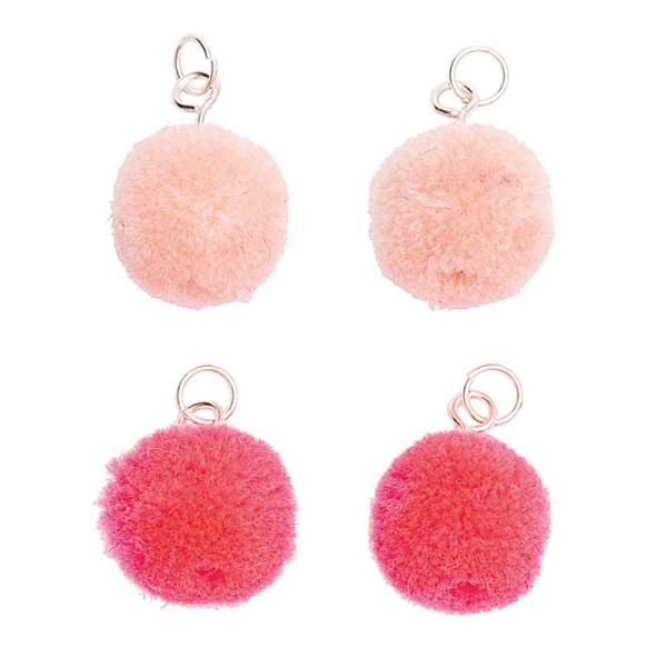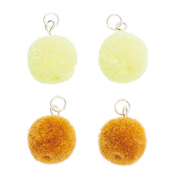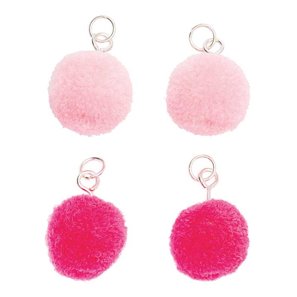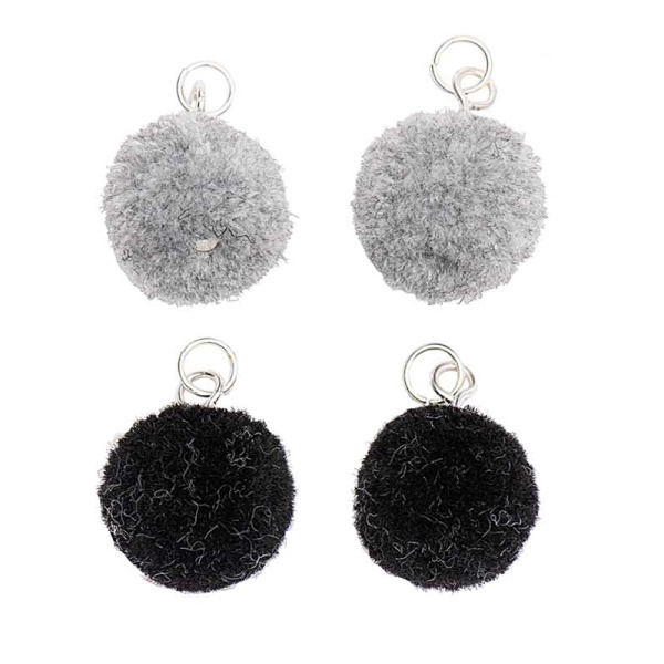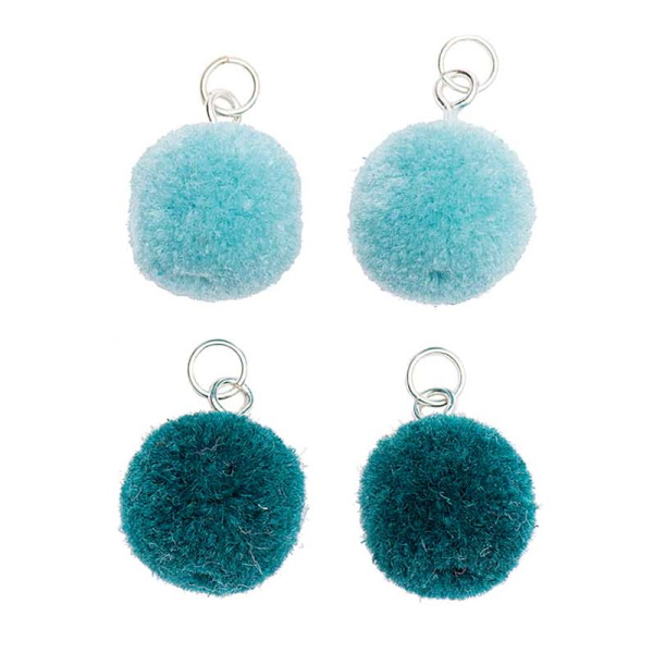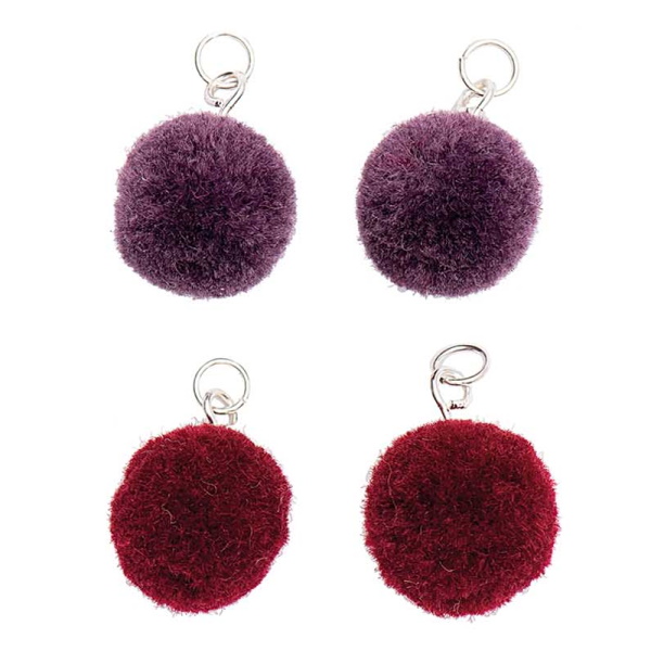 4 söpöä pomponia, joissa on hopeiset silmukat. Kiinnitä korviskoukkuun sellaisenaan tai yhdistä höyhenten ja tupsujen kanssa.