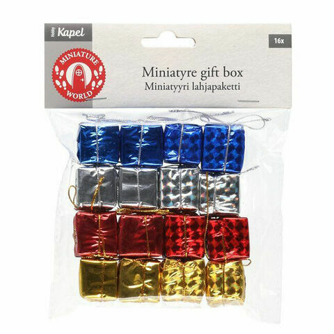 Pakkaus sisältää 16 kpl miniatyyri lahjapaketteja joulun askarteluihin ja asetelmiin.