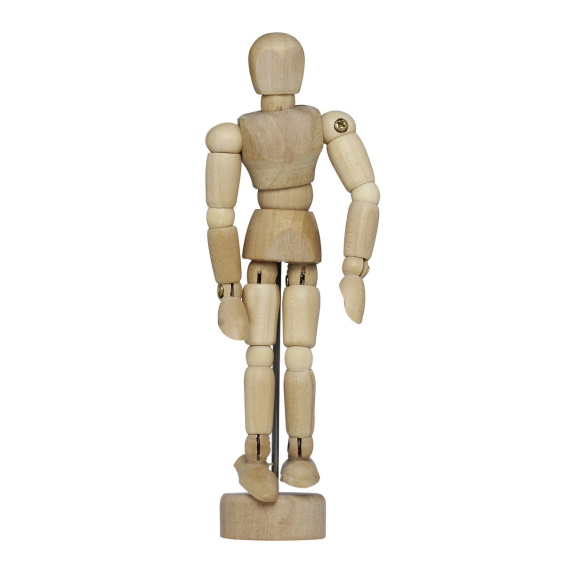 Puinen mini mallinukke. Säädettävä mallinukke pienessä ja joustavassa muodossa. Valmistettu vaaleasta kiillotetusta puusta. Pituus: 11,4 cm, 13,5 cm jalusta mukaan lukien. Oikeat mittasuhteet aikuisen ihmisen keholle. Seuraavat kohdat nuken rungossa ovat säädettävissä: nilkat, polvet, lonkat, vartalo, hartiat, kyynärpäät, ranteet, niska ja pää.