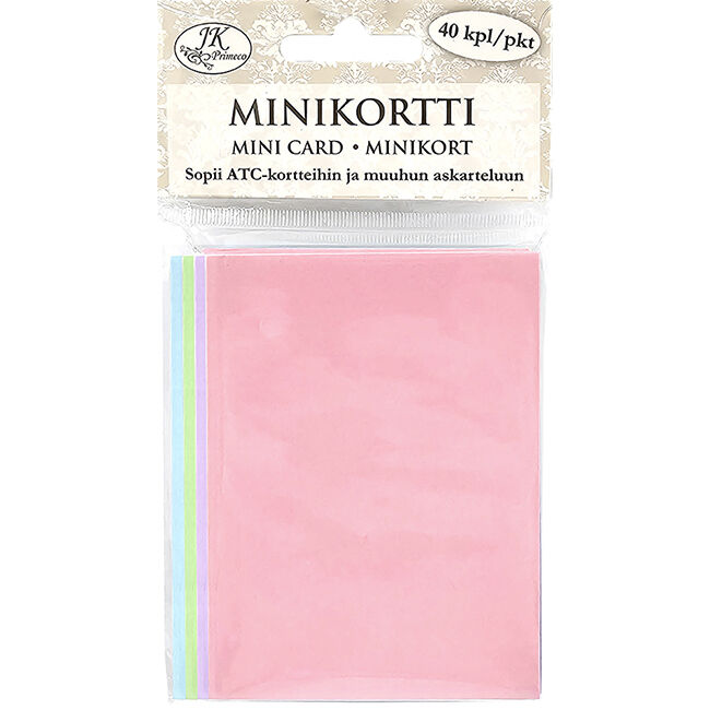 Minikortit askarteluun. Pakkaus sisältää 40 kappaletta minikortteja neljässä eri värissä, 10 kappaletta per väri. Minikortit sopivat ATC eli keräilykortteihin ja muuhun askarteluun.