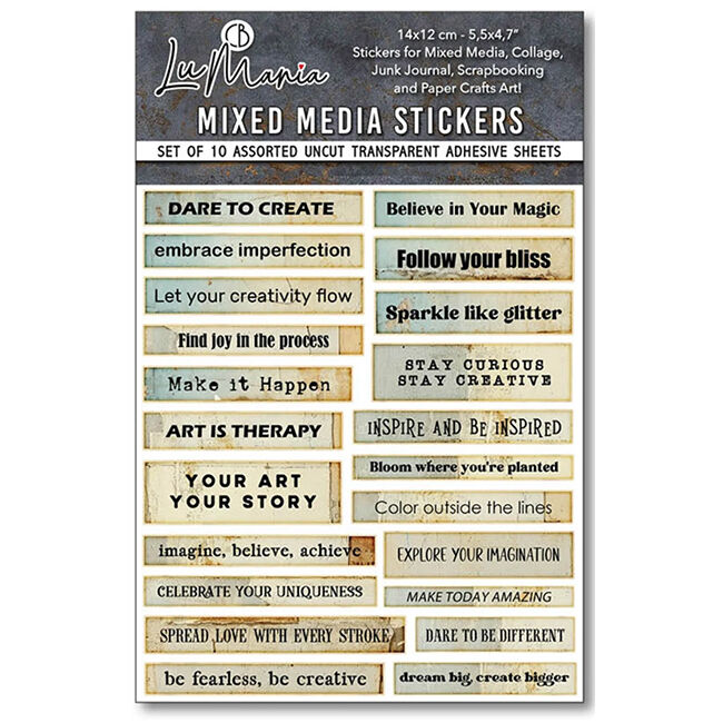 LuMania Mixed Media -tarrasetti. 10 erilaista leikkaamatonta itsekiinnittyvää arkkia. Läpinäkyvä.