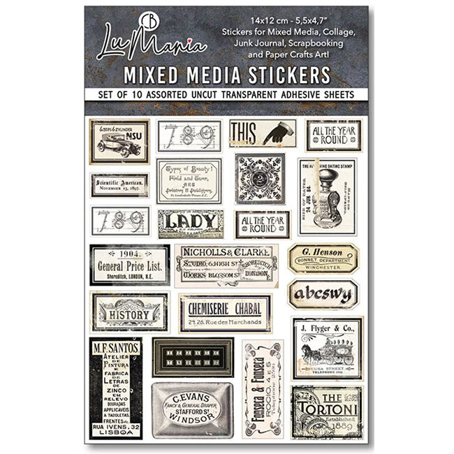 LuMania Mixed Media -tarrasetti. 10 erilaista leikkaamatonta itsekiinnittyvää arkkia. Läpinäkyvä.