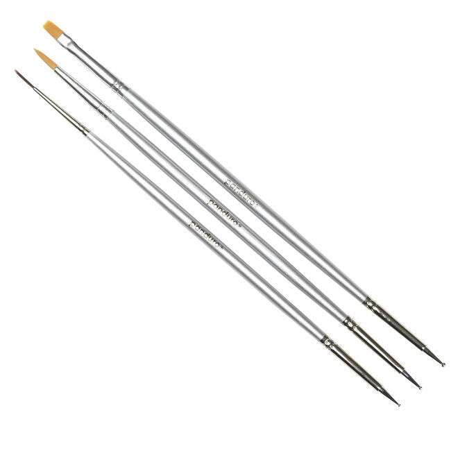 3 kpl synteettisiä siveltimiä, joiden toisessa päässä on metallipallot. Hyvä valinta esimerkiksi posliinin tai kynsien pistemaalaukseen – mutta ne sopivat tietenkin myös kaikkeen muuhun luovaan työskentelyyn.