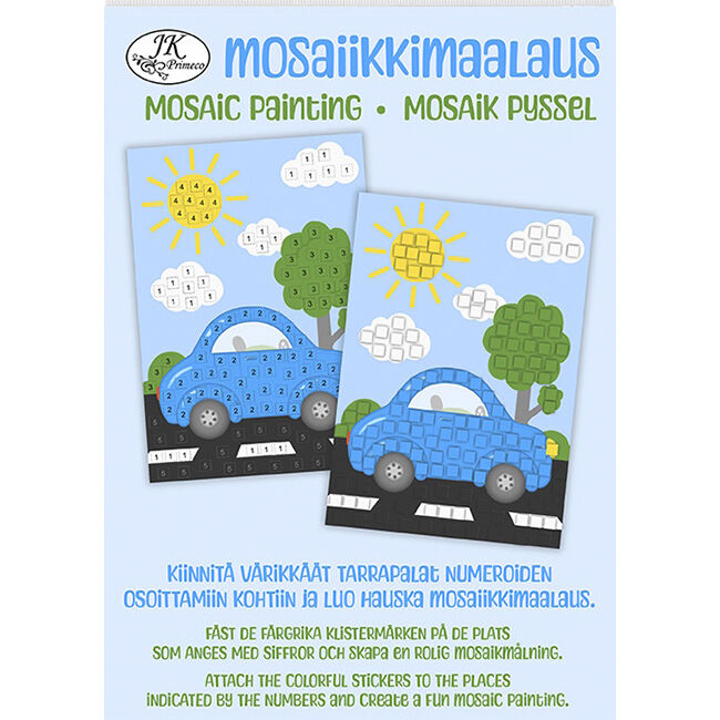 Mosaiikkimaalaus askarteluun ja koristeluun. Kiinnitä värikkäät tarrapalat numeroiden osoittamiin kohtiin ja luo upea mosaiikkimaalaus! Pakkaus sisältää yhden työpohjan ja värikkäät tarrapalat viidessä eri värissä. Värit on lajiteltu numeroittain ja kuvaan on merkitty kunkin värin paikka. Pakkauksen takana on tarkemmat ohjeet mosaiikkimaalauksen askarteluun.