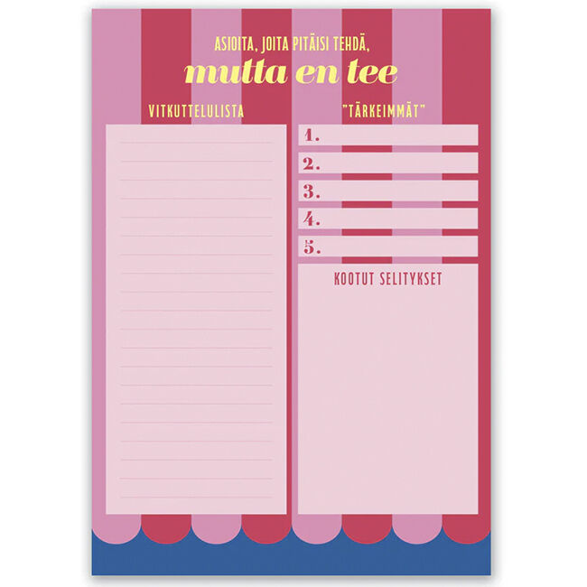 Muistilehtiö päivittäisiin merkintöihin ja aikataulutukseen. Lehtiössä on sinipuna-sävyinen väritys ja otsikot: "Asioita, joita pitäisi tehdä, mutta en tee / Vitkuttelulista / Tärkeimmät / Kootut selitykset". Lehtiössä on 52 samanlaista irtirepäistävää sivua. Paperilaatu 100 gsm2. Koko A5: 150 x 210 mm. Tuotteessa on Design from Finland -merkki.
