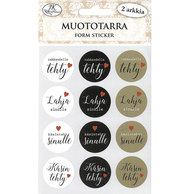 Pakkauksessa 2 arkkia, 12 tarraa/arkki. Yhden tarran halkaisija n. 2,8cm.