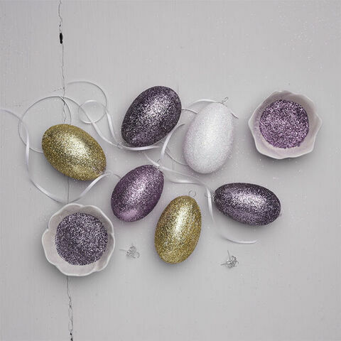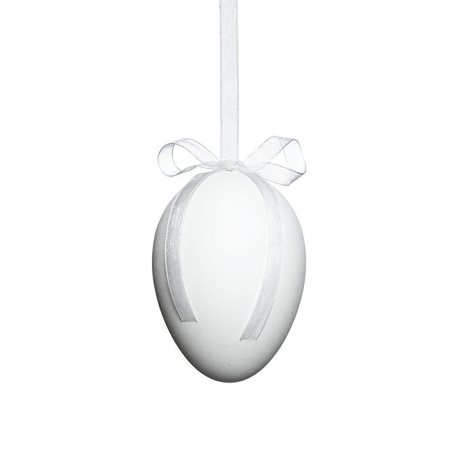 Valkoisesta muovista valmistetut munat. 5,3 x 8 cm. Organzanauharipustuksella. 6 kpl:n pakkaus.