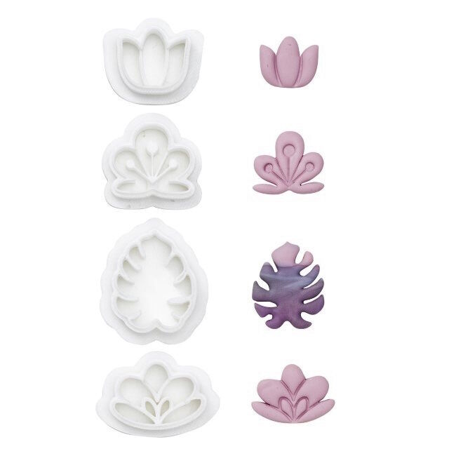 Pienet ja kauniit savileimat, joissa on 4 lehti- ja kukka-aiheista leikkausta. Sopii eri tyyppisille saville ja polymeerimassalle. Muotit on valmistettu muovista ja niiden avulla voit helposti lyödä kauniita pieniä kuvioita koristeluun ja koruihin riipuksien/korujen ja korvakorujen muodossa.