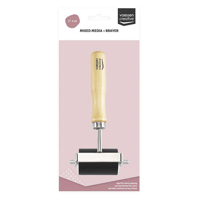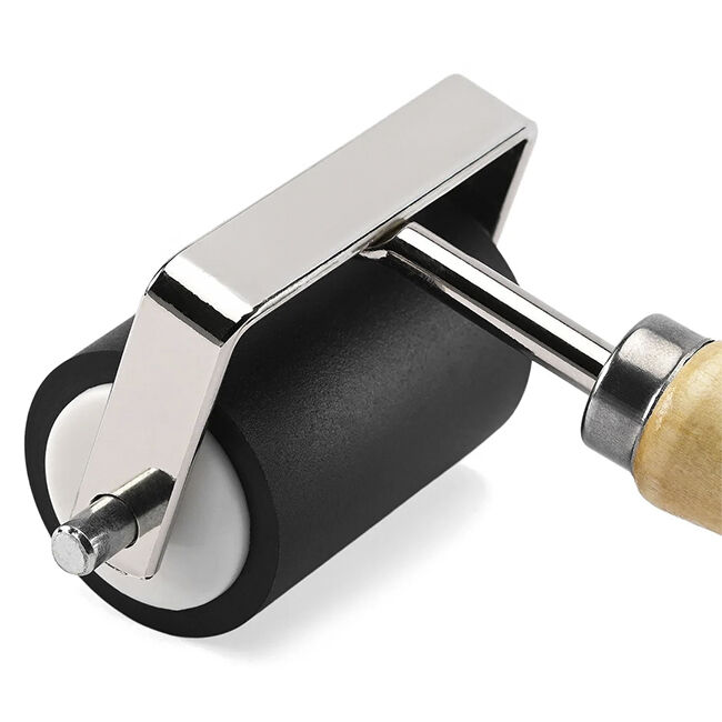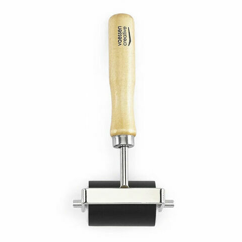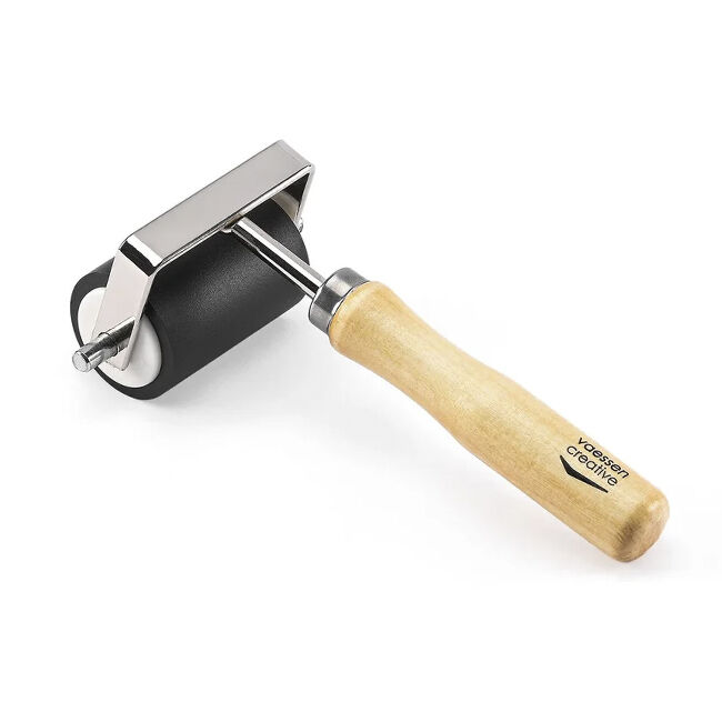 Telaa voidaan käyttää kahdella tavalla: ajaa se maalin tai musteen läpi ja levittää sitten maali tai muste pinnan yli tai levittää maali/muste suoraan pinnalle ja levittää se sitten tasaisesti telalla. Tämä mustela on 5 cm leveä ja valmistettu puusta ja kumista. Jos projektisi on leveämpi kuin tela, telaa varovasti ja vältä liian voimakasta painetta. Liian kova painaminen tai liiallinen musteen tai maalin käyttö voi aiheuttaa viivojen ilmestymistä telan reunoille. Haluatko täysin raidattoman pinnan? Käytä aina telaa, joka on leveämpi kuin projektisi.