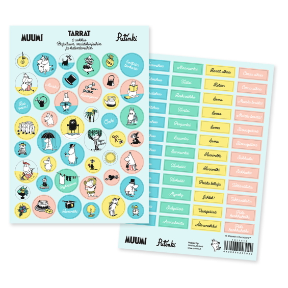 Kaksi arkkia pyöreitä ja neliskulmaisia muumi-aiheisia tarroja bujoiluun, muistikirjoihin ja kalentereihin.