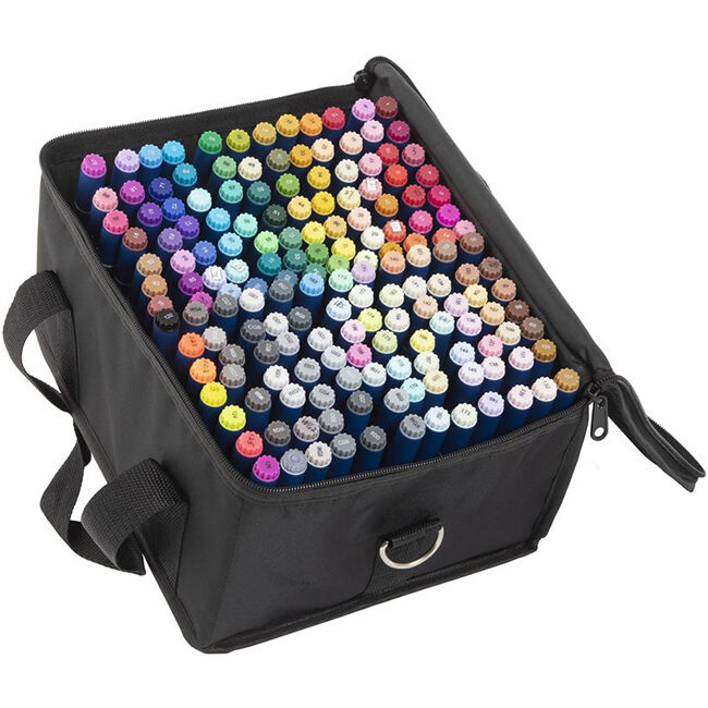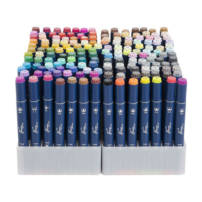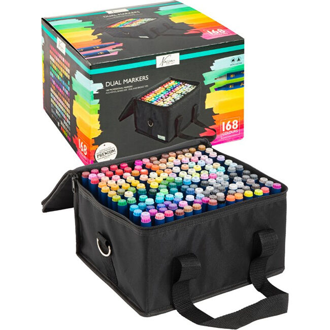 Tämä Nassau Fine Artin säilytyslaukku, jossa on 168 värikästä kaksikärkistä tussia, on jokaisen luovan ihmisen pakollinen hankinta. Tämän laajan väripaletin avulla voit luoda kauneimpia kortteja, piirroksia ja käsinkirjoituksia. Tusseissa on alkoholipohjainen muste, jonka etuna on, että voit luoda kauniita värisiirtymiä, valo- ja varjoefektejä. Voit myös värittää saman kappaleen useita kertoja ilman paperin käpristymistä. Tusseissa on kärki kummassakin päässä, toisessa terävä kärki, toisessa litteä. Tussit toimitetaan tukevassa kotelossa, jossa voit helposti säilyttää ja kuljettaa niitä.