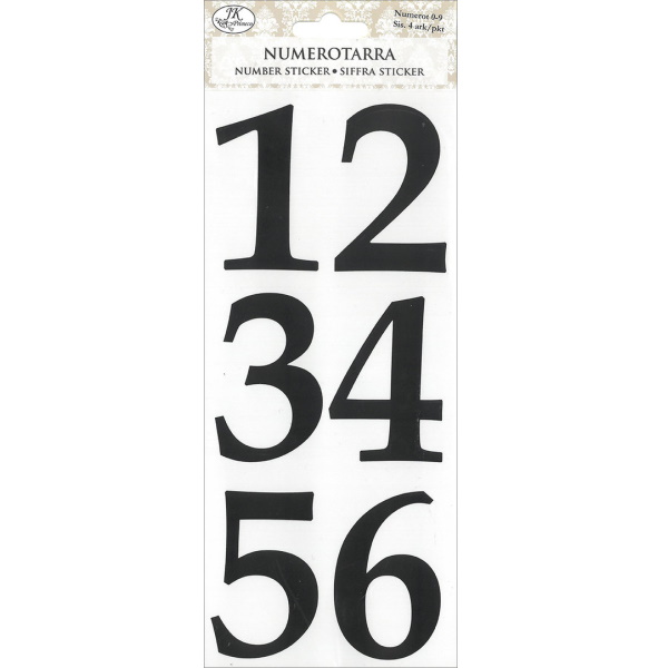 Numerotarrat askarteluun ja koristeluun. Pakkaus sisältää neljä arkkia, jossa on muoviset numerotarrat 0-9.