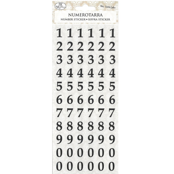 Numerotarrat askarteluun ja koristeluun. Pakkaus sisältää yhden arkin, jossa on muoviset numerotarrat 0-9.