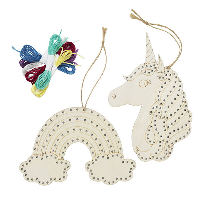 Ompelulevyt kauniin yksisarvisen ja sateenkaaren muotoisina. Levyt on valmistettu vaaleasta, huolellisesti veistetystä ja rei'itetystä puusta. Sateenkaari on kooltaan 15 × 10 cm, yksisarvinen 11 × 16,5 cm ja molemmissa on juuttinaru ripustamista varten. Seuraava vaihe on hauska ja hieman erilainen tapa kokeilla kirjontaa. Kirjonta langalla reikien läpi on melkein kuin värittäisi langalla – eikä mikään estä sinua ensin maalaamasta ja koristelemasta hahmoa ennen kuin alat ommella sen päälle. Värikynät tarttuvat hyvin vaaleaan puuhun, samoin kuin lasten akryylimaalit. Pakkaus sisältää 2 ompelulevyä, 6 × 1,2 metriä kirjontalankaa ja 1 muovineulan.