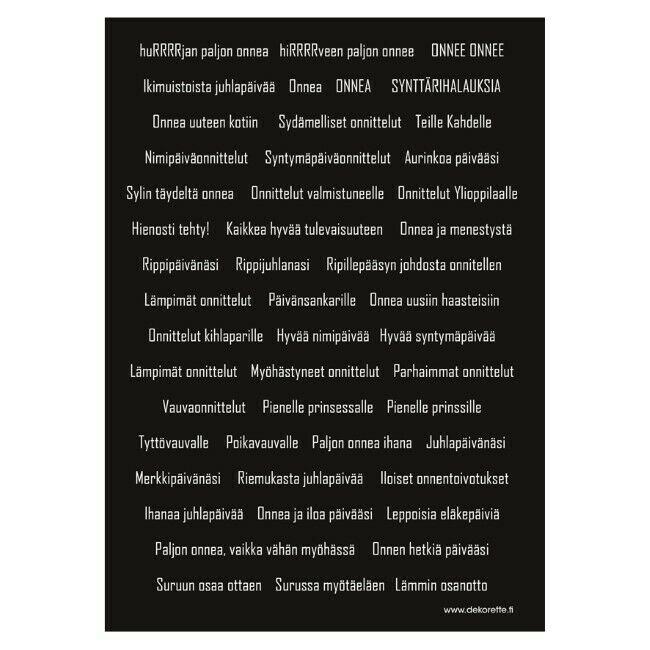 Yksi n. 14,5 x 20 cm kokoinen tarra-arkki, mattapinta. Tarrojen korkeus n. 1,2 cm.