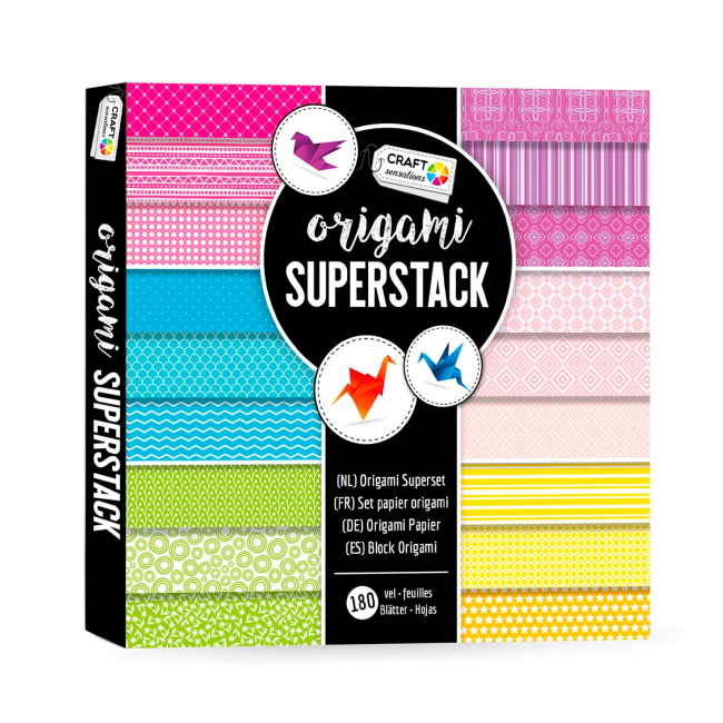 Neliön muotoisissa arkeissa on monia iloisia kuvioita, joiden värit ovat vaaleanpunainen, sininen, vihreä, oranssi, keltainen, vaaleanpunainen ja violetti. Origami Superpack -kirjasen edessä on 9 taitettavaa esimerkkiä.