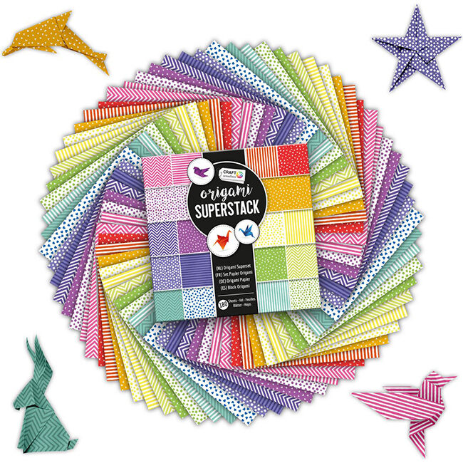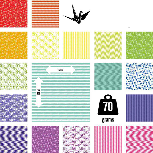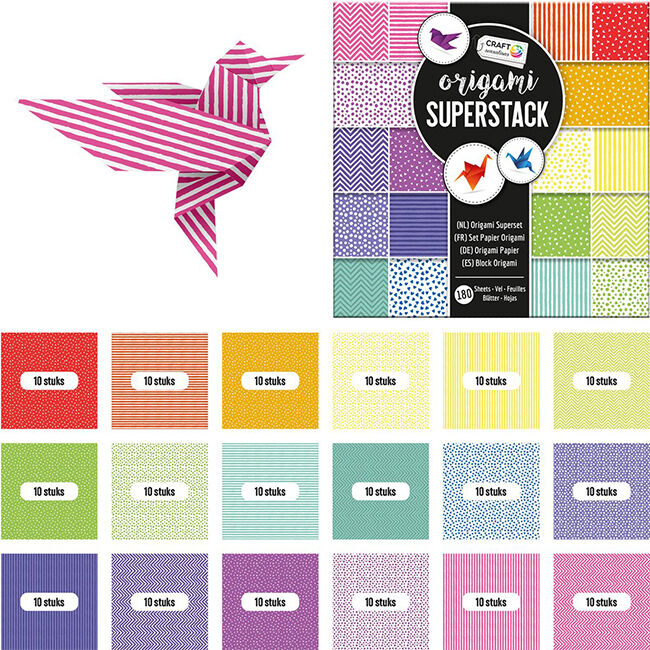 Pakkauksessa 180 arkkia, joissa 18 erilaista kuosia. Koko 15 x 15 cm. Mukana myös ohjeita.