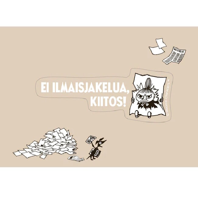 Muumi ovitarra. Kosteuden kestävää materiaalia, joka tarttuu hyvin mutta irtoaa jälkiä jättämättä. Teksti: Ei ilmaisjakelua. Koko 105 x 148 mm.