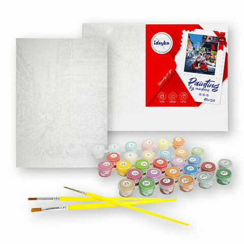 - Valmiiksi pingoitettu kanvaasikangas. Kankaalla kuvan ääriviivakaavio numeroineen. Koko 40 x 50 cm.