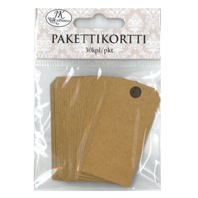 Pakkauksessa 30 pakettikorttia, yhden kortin koko 6 x 3cm.