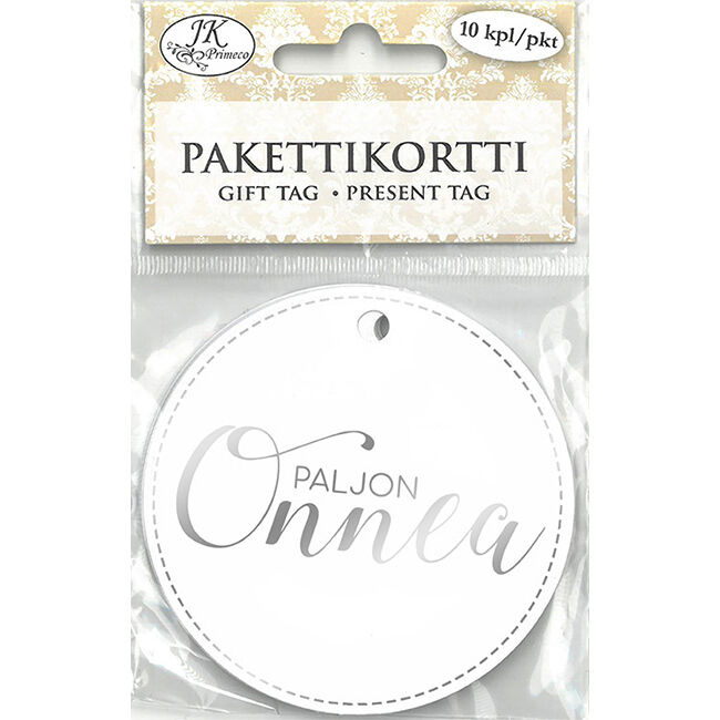 Pakettikortti paketointiin ja askarteluun. Pakkaus sisältää 10 kappaletta kartonkisia pakettikortteja, joissa on tekstiä. Pakettikorteissa on hopeinen foliopainatus.