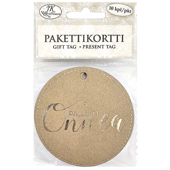 Pakettikortti paketointiin ja askarteluun. Pakkaus sisältää 10 kappaletta kartonkisia pakettikortteja, joissa on tekstiä. Pakettikorteissa on kultainen foliopainatus.
