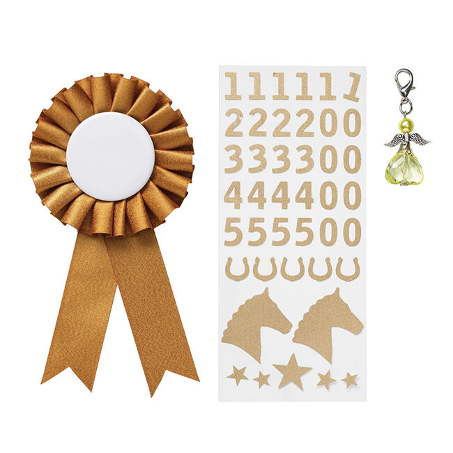Palkintoruusuke ja tarvikkeet keppihevoselle kulta