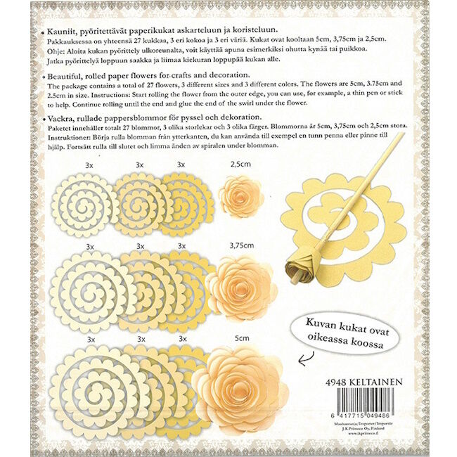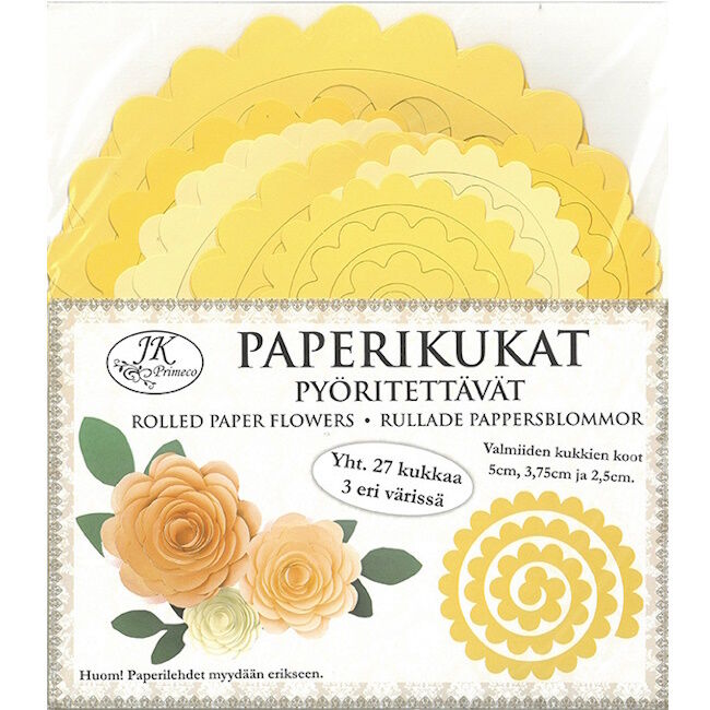 Pyöritä valmiiksi leikattu sapluuna rullalle ja askartele upea kolmiulotteinen paperikukka! Tarvitset vain liimaa tai kaksipuolista teippiä kukan loppupään kiinnittämiseen. Pakkauksen takana tarkemmat ohjeet paperikukkien askarteluun.