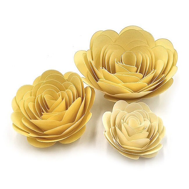 Valmiista pakkauksesta tulee 27 kukkaa, 3 eri kokoa/3 eri väriä. Valmiiden kukkien halkaisijat 2,5cm, 3,75cm ja 5cm.