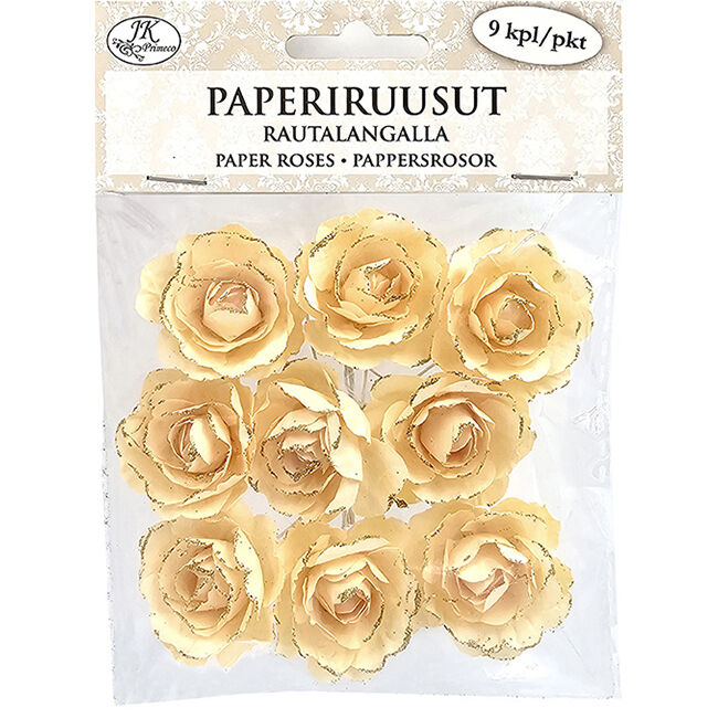 Paperiruusut askarteluun ja koristeluun. Pakkaus sisältää yhdeksän kappaletta paperisia ruusuja, joissa on rautalanka ja glitteriä.