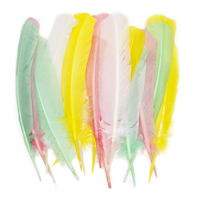 Sulkia, noin 30 cm pitkiä pastellivärisiä pääsiäishöyheniä. Täydellisiä pääsiäiskorien koristeluun ja kaikenlaisiin pääsiäisaskarteluun. Sulat ovat poikkeuksellisen kauniita koriste-esineitä ja sopivat hyvin tee-se-itse- ja kodinsisustukseen. Ehkä haluat tehdä unisiepparin?