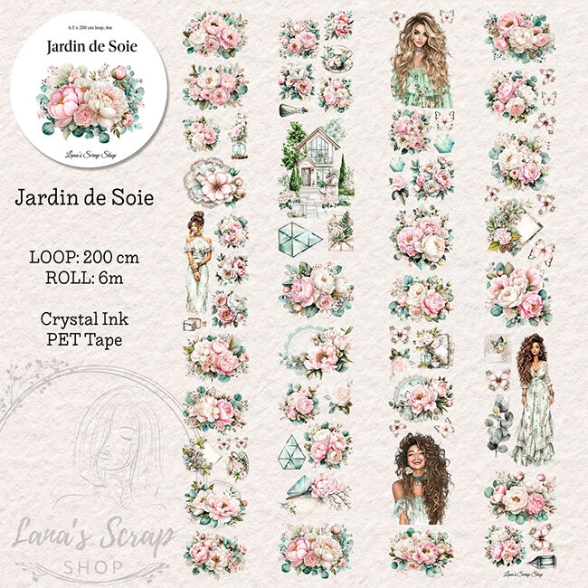 Jardin de Soie on ensiluokkainen Crystal Ink PET -teippi, joka on saanut inspiraationsa kukkivan silkkipuutarhan eleganssista. Pehmeät punertavat kukkakuviot, kermanväriset ruusut ja hillityt eukalyptussävyt luovat herkän, hienostuneen tunnelman, joka tuntuu ilmavalta, sirolta ja ajattomalta.