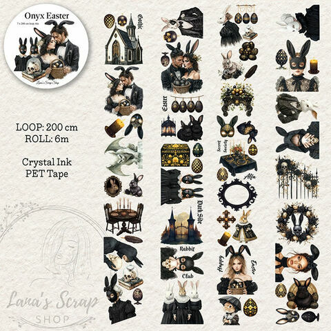 Onyx Easter on goottihenkinen PET-teippi, joka tulkitsee pääsiäisen uudelleen Dark Academyn maailman ja viktoriaanisen fantasian estetiikan kautta. Teippiin kuuluu mustia kaneja, koristeellisia munia, katedraalielementtejä, kynttilänvaloa, kalloaiheita ja barokkikukkia dramaattisessa mustan, kullan ja norsunluun värisessä paletissa.