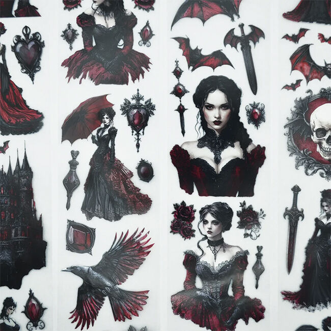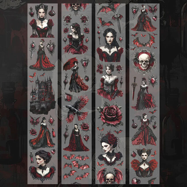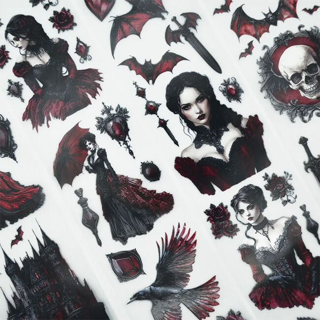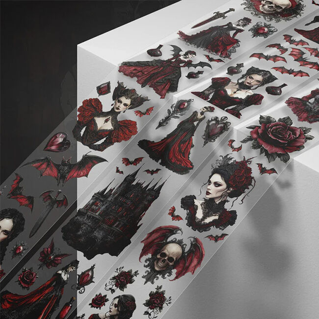 Astu yön synkkään ja viettelevään maailmaan "The Vampire Countess" PET-teipin avulla. Tässä teipissä on elegantteja vampyyreja, lepakoita, pahaenteisiä variksia ja muita aavemaisia elementtejä, jotka herättävät goottilaisen ja salaperäisen tunnelman. Täydellinen lisä Halloween-askarteluun tai mihin tahansa projektiin, joka kaipaa makaaberin makua.