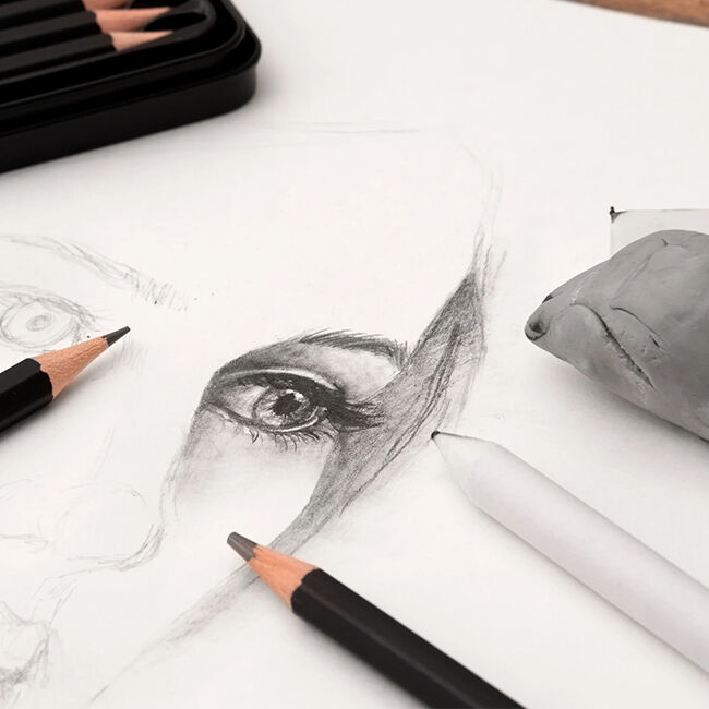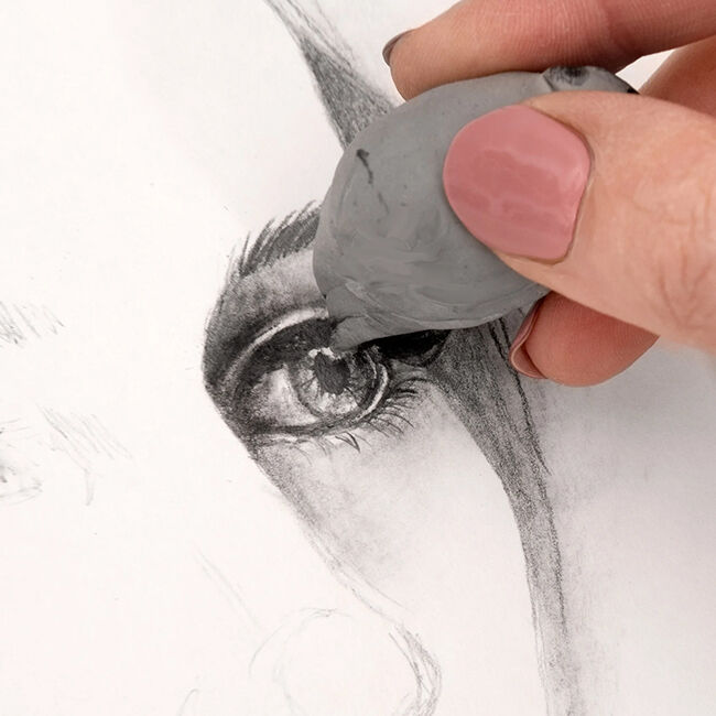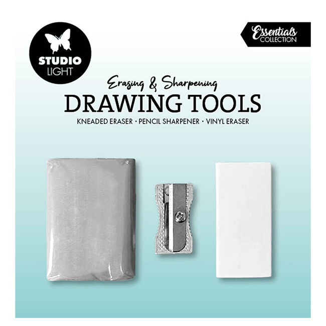 Essentials-piirustustyökalut: Vaivattu (kneaded) pyyhekumi, metalliteroitin ja vinyylipyyhekumi.