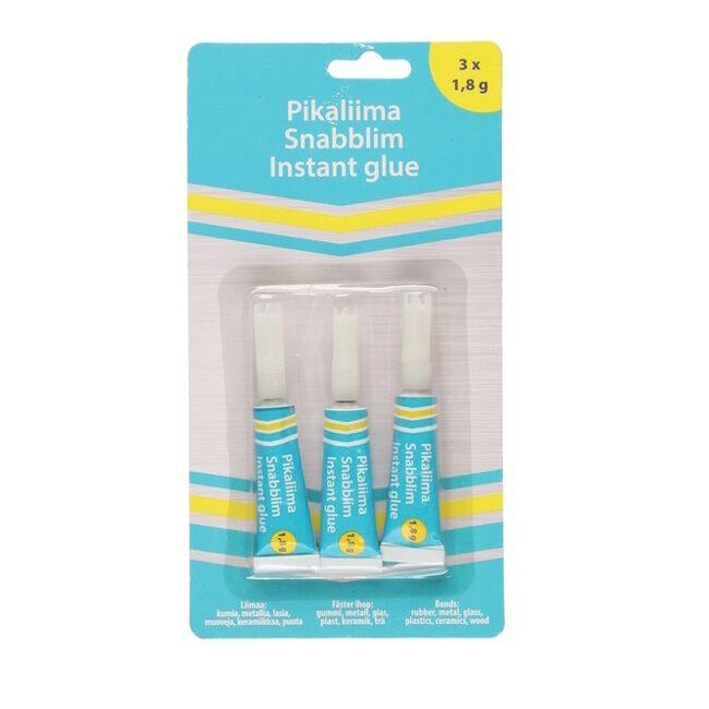 Tehokas pikaliima liimaa kumia, metallia, lasia, muoveja, keramiikkaa ja puuta. Pakkaus sisältää 3 x 1,8 g.