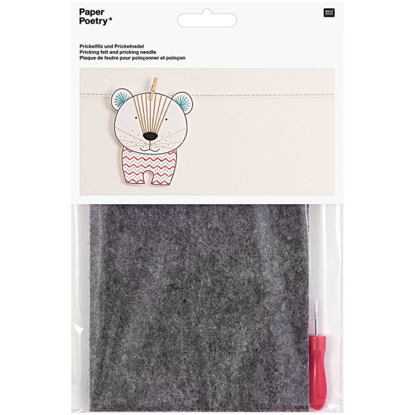 Pistelyneula ja alusta ompelukuvien reikien tekemiseen. Alustan koko 18 x 12,5 x1 cm, neula noin 6,5 cm.