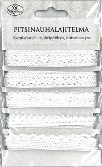 Lajitelma valkoisia pitsinauhoja askarteluun, paketointiin ja koristeluun.