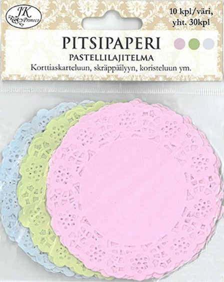 Pakkauksessa 30kpl pitsipapereita, jokaista väriä 10kpl.