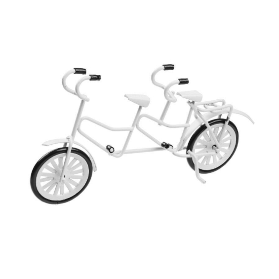 Miniatyyri tandempolkupyörä seisontatuella. Koko 12 x 7 cm.