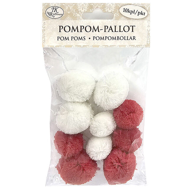 Pompom-pallot askarteluun ja koristeluun. Pakkaus sisältää 10 kappaletta pompom-palloja kahdessa eri värissä: punainen ja valkoinen.