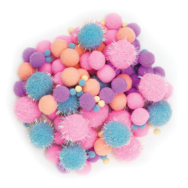 Pussit sisältävät 150 ihanaa pompom-palloa! Yhteistä kaikille sekoituksille on se, että ne sisältävät erikokoisia pörröisiä pompomeja – kimallesäikeillä ja ilman.