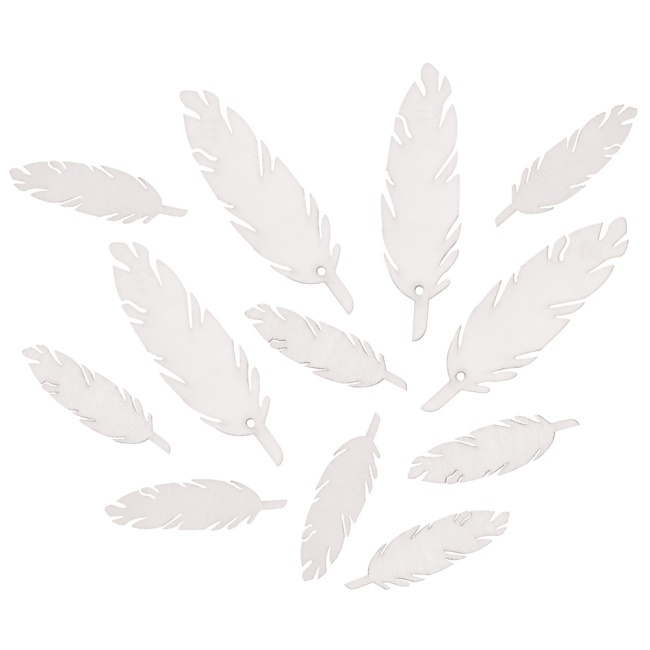 Pakkaus sisältää yhteensä 12 valkoista höyhentä kahdessa koossa, 7 ja 4 cm. Neljässä suuressa on reikä, joten voit ripustaa ne tai kiinnittää koristeeseesi.
