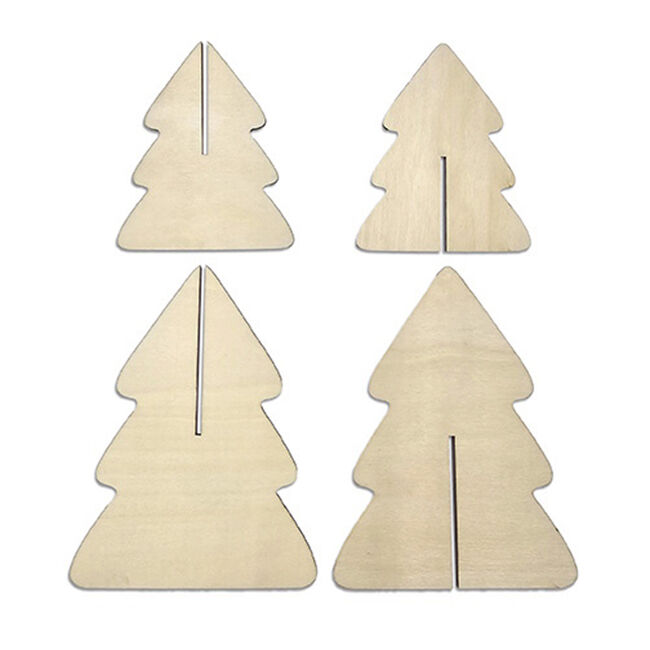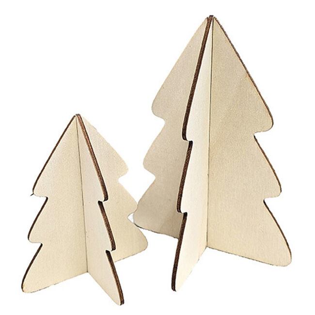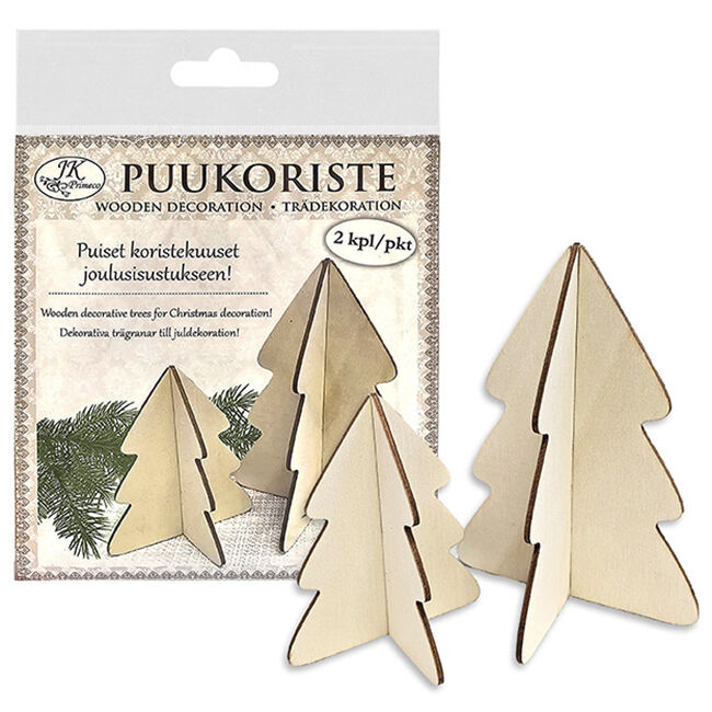 Puukoristeet askarteluun ja koristeluun. Pakkaus sisältää kaksi kappaletta kaksiosaisia puisia kuusia.