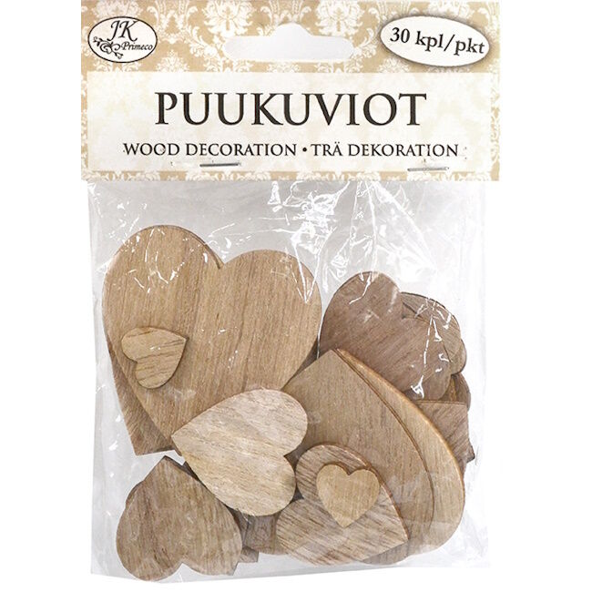 Pakkauksessa 30 puusydäntä.