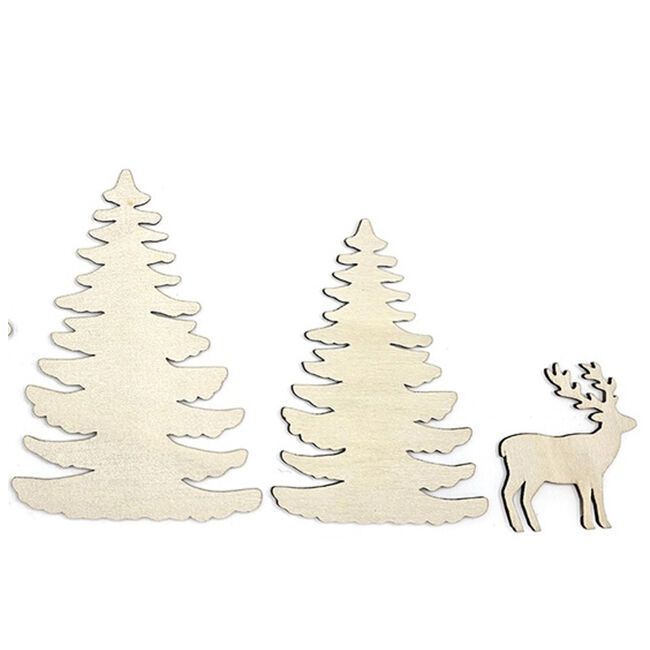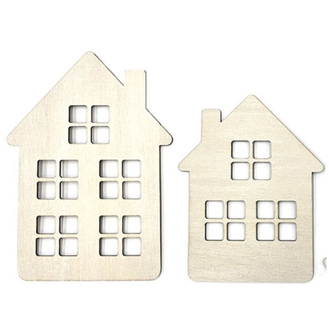 Puiset koristekuviot askarteluun ja koristeluun. Pakkaus sisältää kaksi kappaletta puisia taloja kahdessa eri koossa.