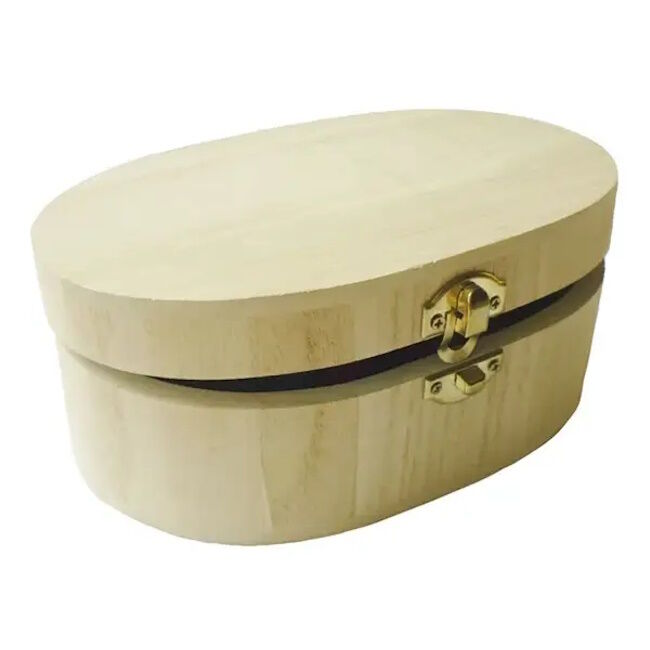Puinen laatikko, jossa läppäkansi ja kullanvärinen metallisuljin. Laatikon muoto on soikea. Voit koristella tämän laatikon esimerkiksi akryylimaaleilla tai decoupage-tekniikalla tms.
