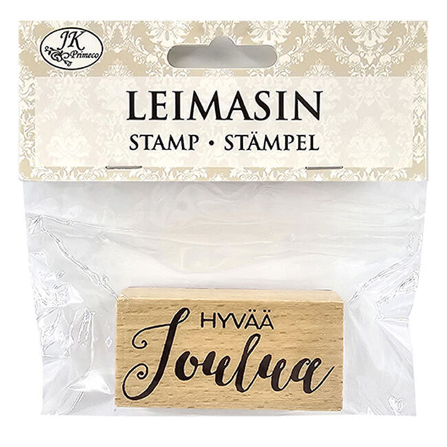 Pakkaus sisältää yhden puisen leimasimen, jonka tekstin koko on noin 2,5cm x 5cm.